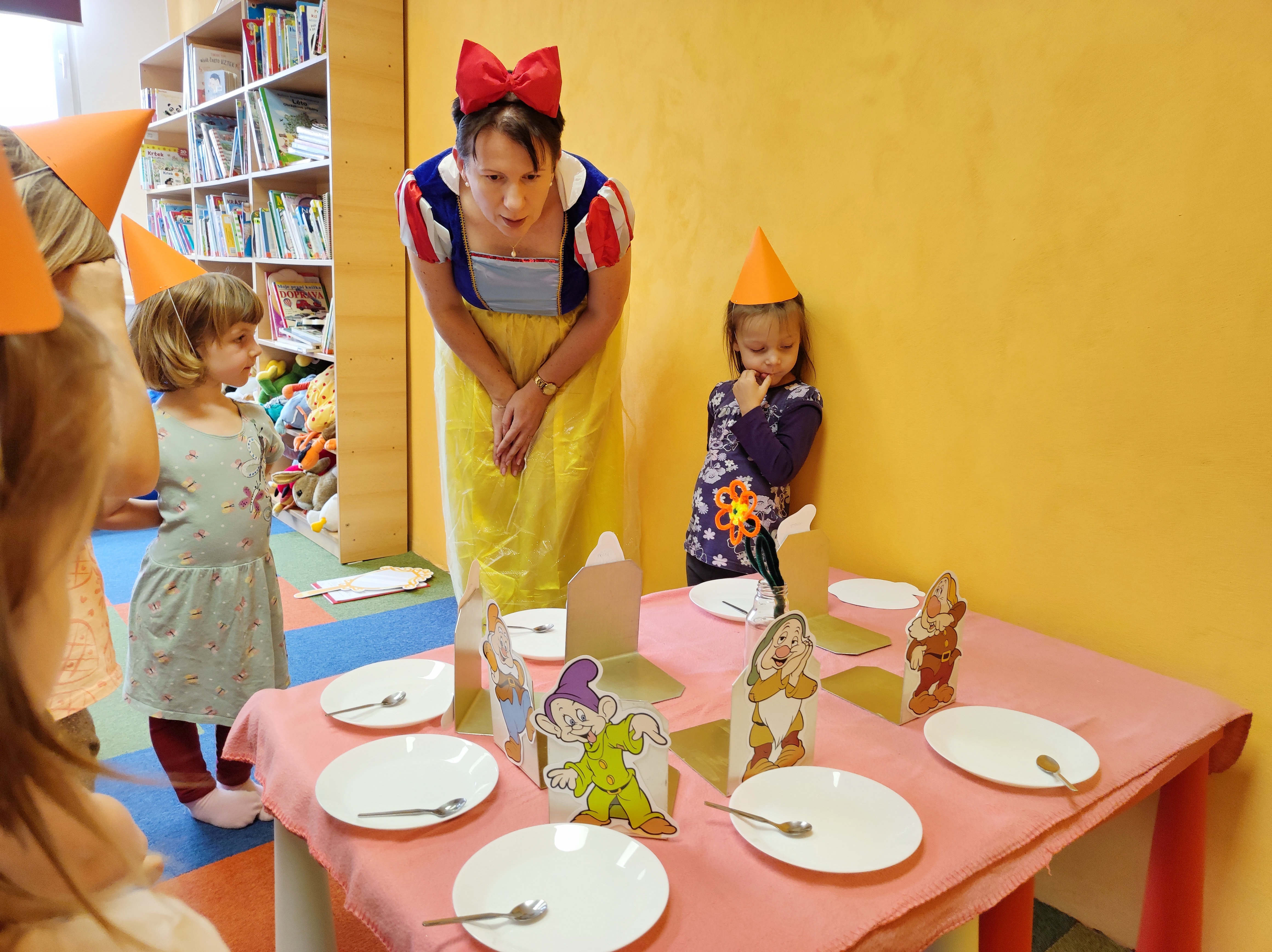 Odpolední skupinka starších dětí (3-6) si pak na vlastní kůži prožila příběh O Sněhurce. Každé dítě dostalo svou trpasličí čepičku, kterou si v rámci dílničky následně nazdobilo. Úspěch měl hudební průvod se Sněhurkou nebo připravování domečku pro trpaslíky.