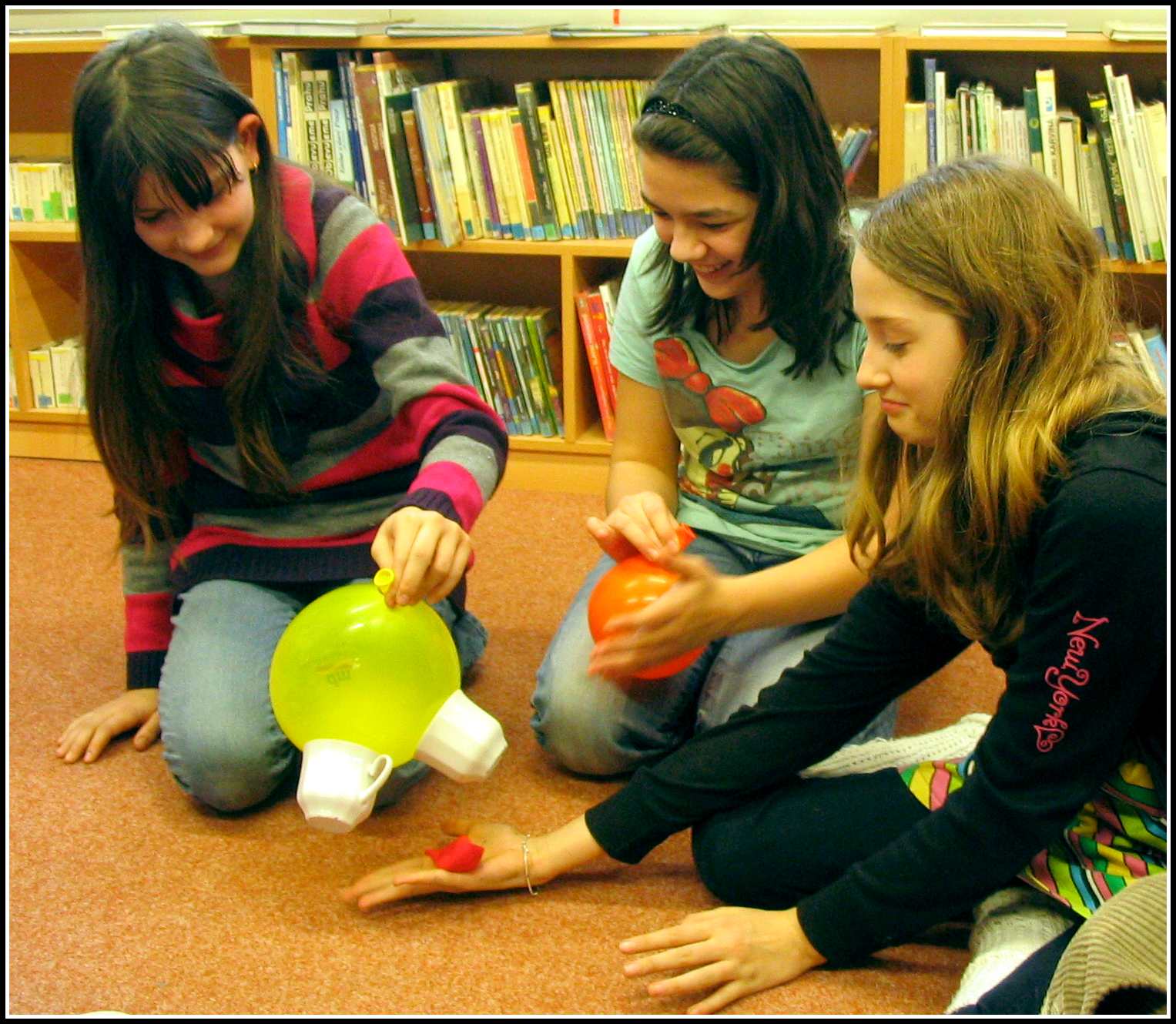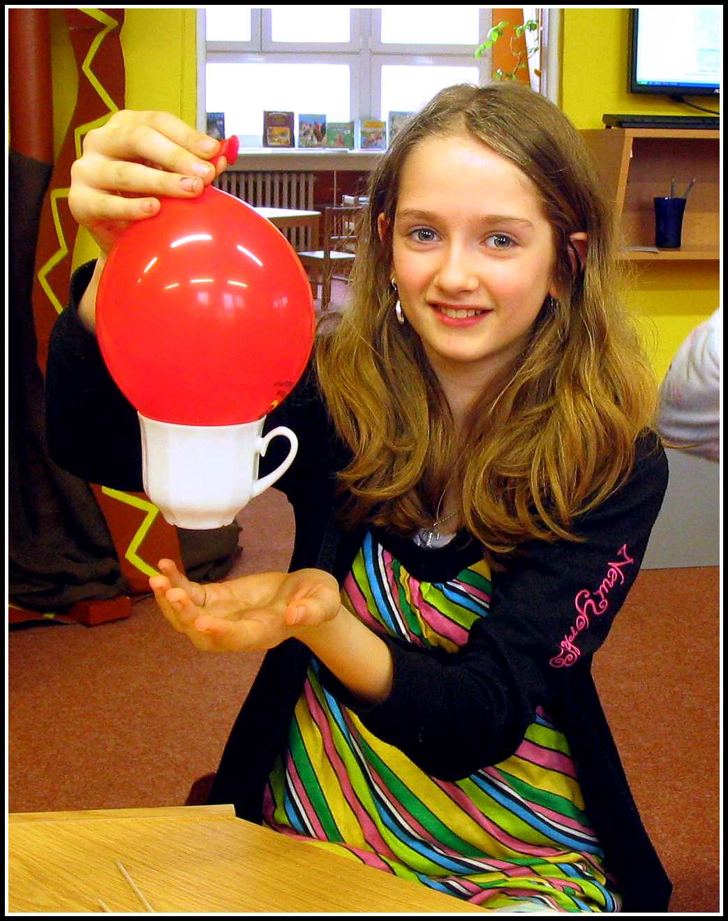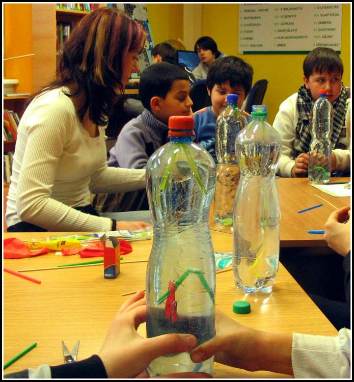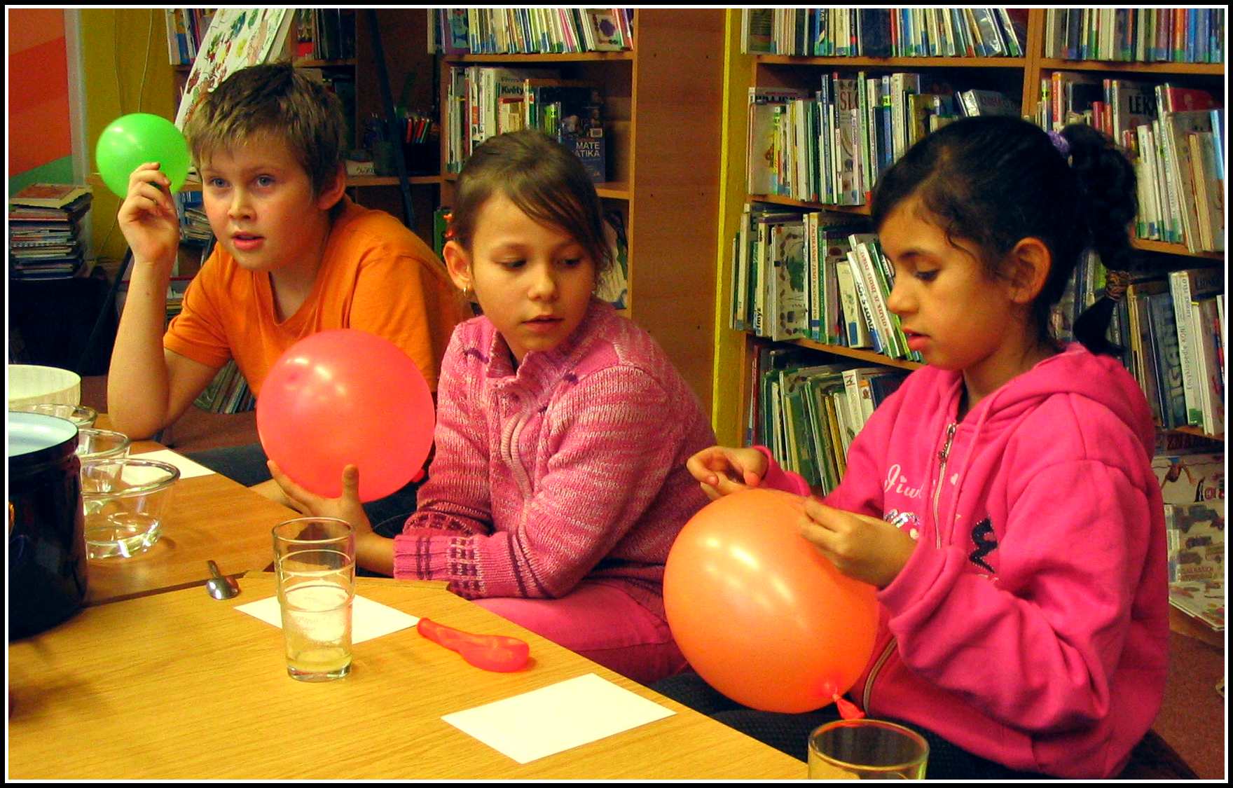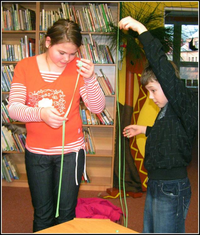 Naposledy jsme si například „hráli“ s tlakem – co to je, jak působí a kde se s ním můžete setkat. Použili jsme k tomu pokusy s propichováním nafouknutých balónků špejlemi tak, aby balónky nepraskly, přisáváním hrníčků a potápějícími se brčky. Kromě toho jsme bádali nad tím, že brčko dokáže držet na stěně, aniž by se k tomu použilo lepidlo. Jak to, že tam drží? Ten, kdo chodí pravidelně na naše pokusy by vám to jistě vysvětlil. Stačí třít brčko o vlasy a ejhle, co dokáže elektrický náboj a protipóly. Na některé naše pokusy nezapomene ani naše paní uklízečka, jako třeba na vyrábění slizu, který se následně nacházel po celé knihovně :-)