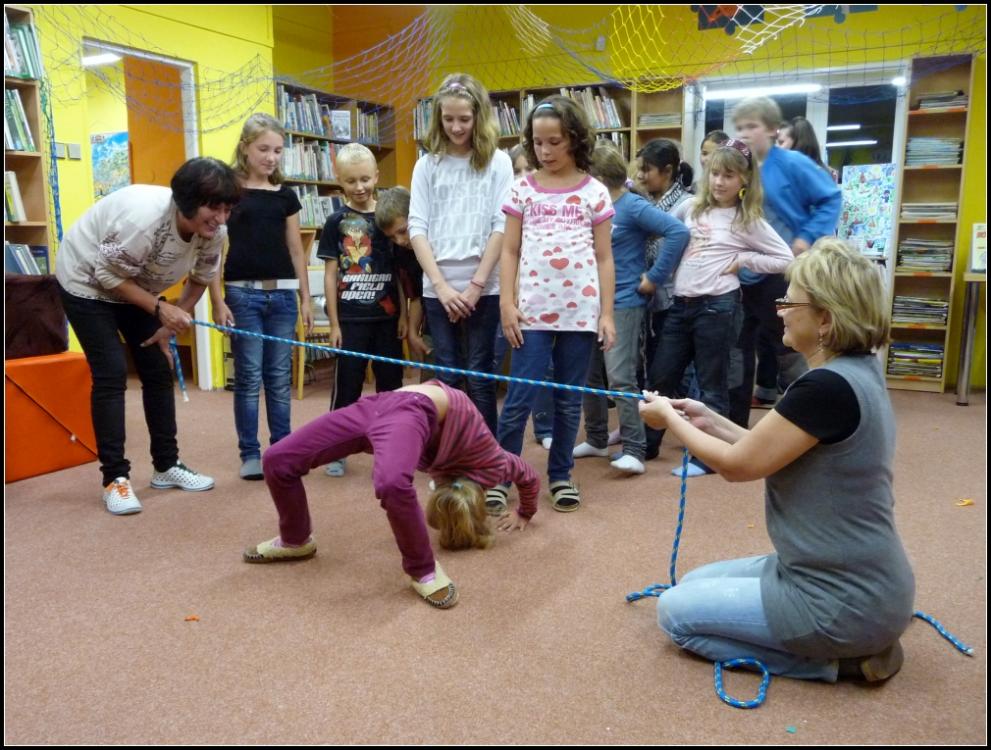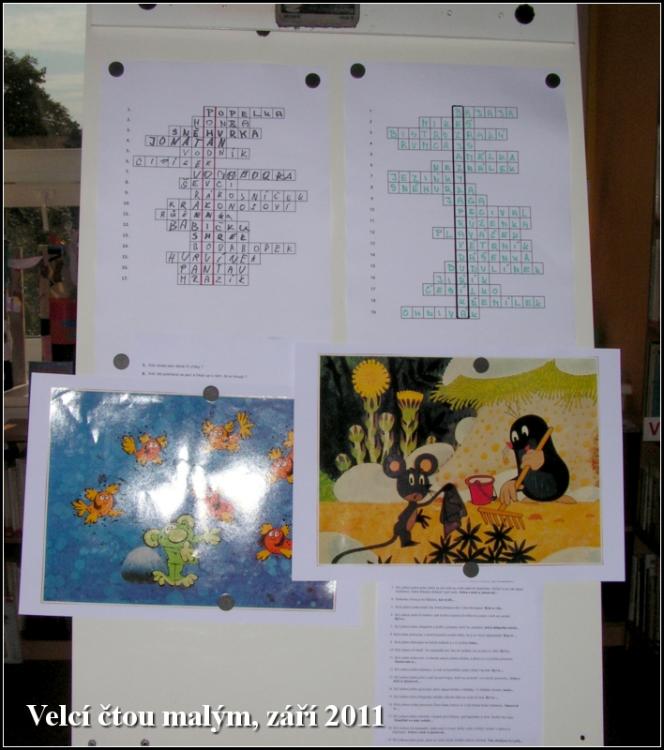 V úterý 4.10. se zde již po čtvrté sešli žáci ZŠ Dr. E. Beneše - třeťáci se svými staršími spolužáky, aby zde strávili společný čas čtením. Ale tentokrát bylo vše naruby. Proč? Protože četli menší svým starším spolužákům pohádky z večerníčků a ti starší poznávali o které pohádky se jedná. Osmáci jim na oplatku přečetli ukázku z knihy Povídky o upírech a v závěru hodiny si společně vyluštili křížovky.