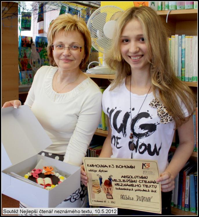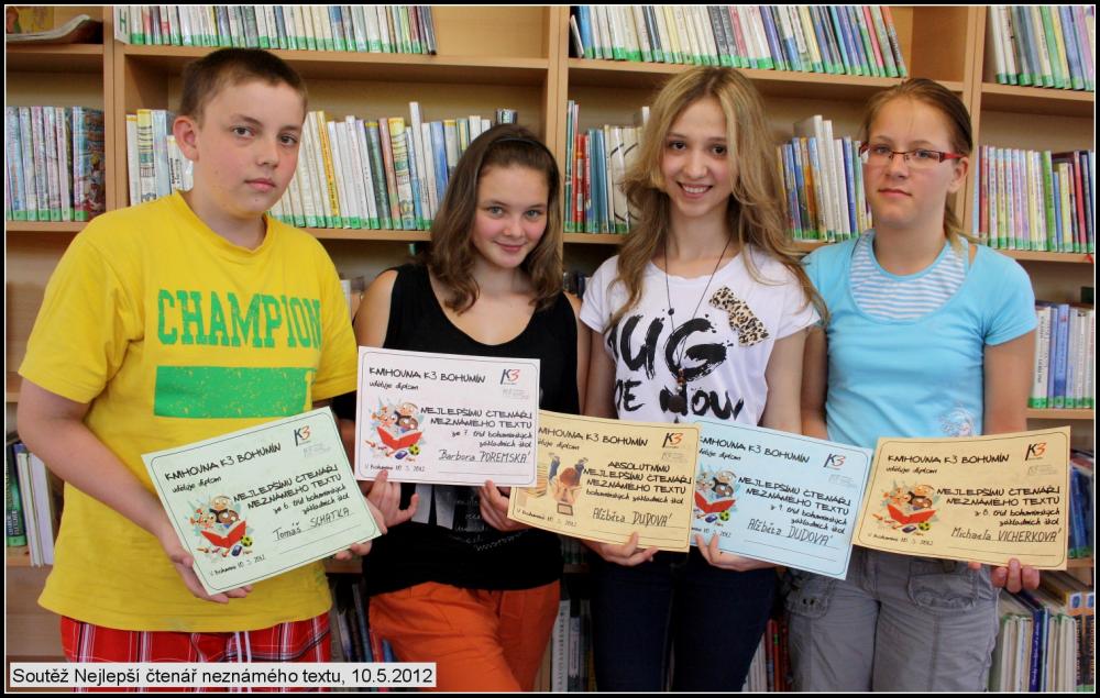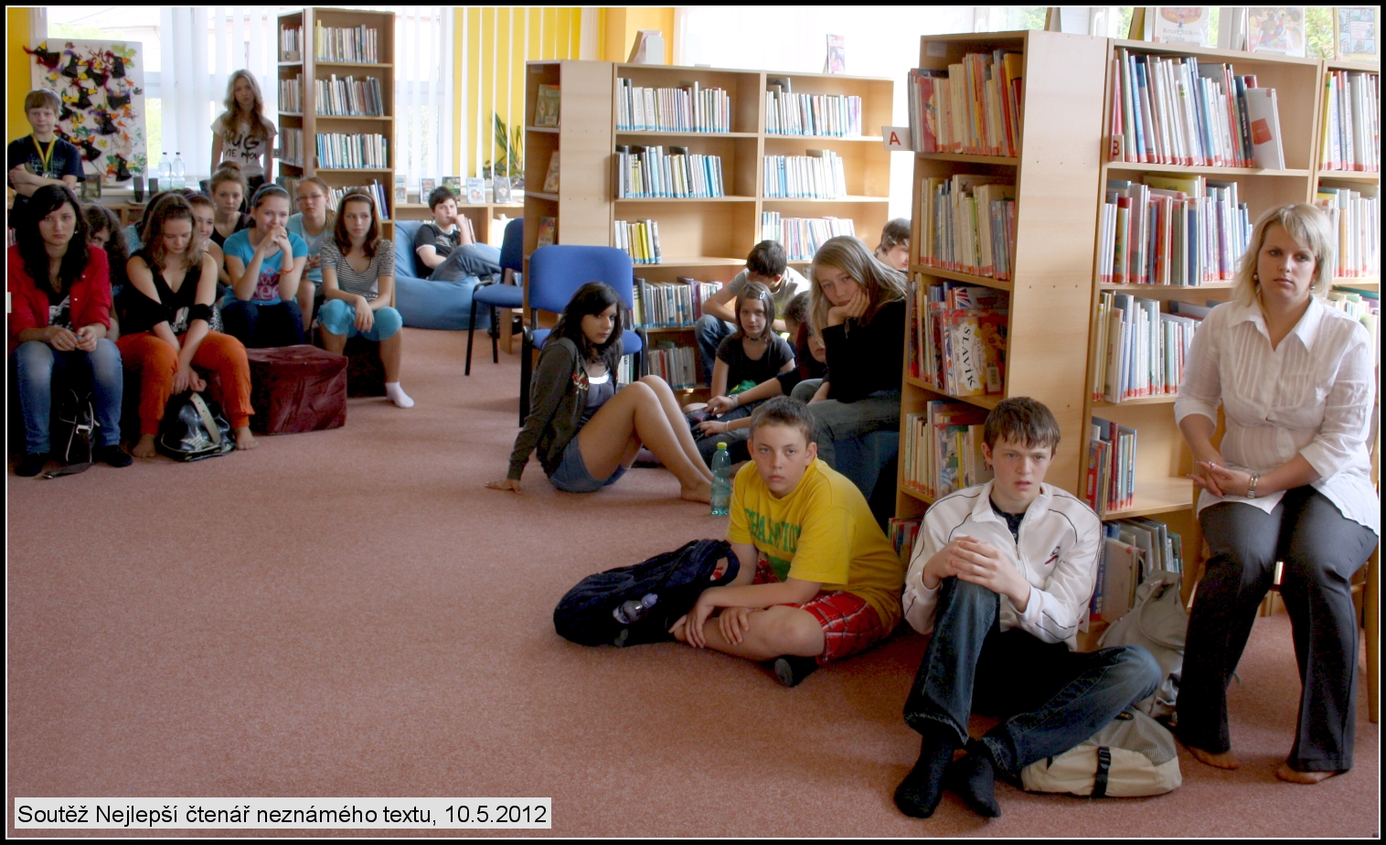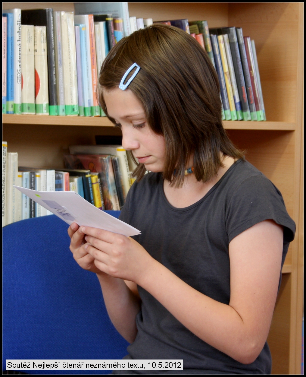 Ve čtvrtek 10. 5. 2012 se v dětském oddělení sešli žáci 6. - 9. tříd ZŠ a odpovídajících ročníků gymnázia. Proč? Soutěžilo se. Soutěžilo se ve čtení neznámého textu.