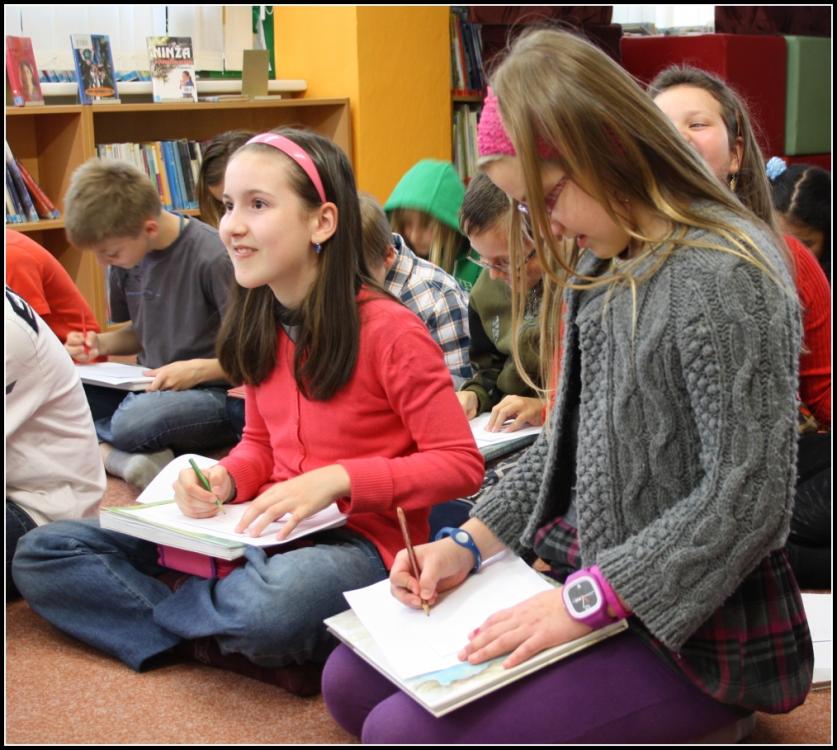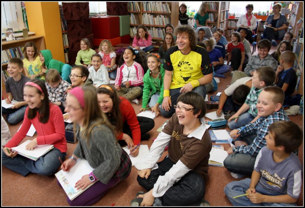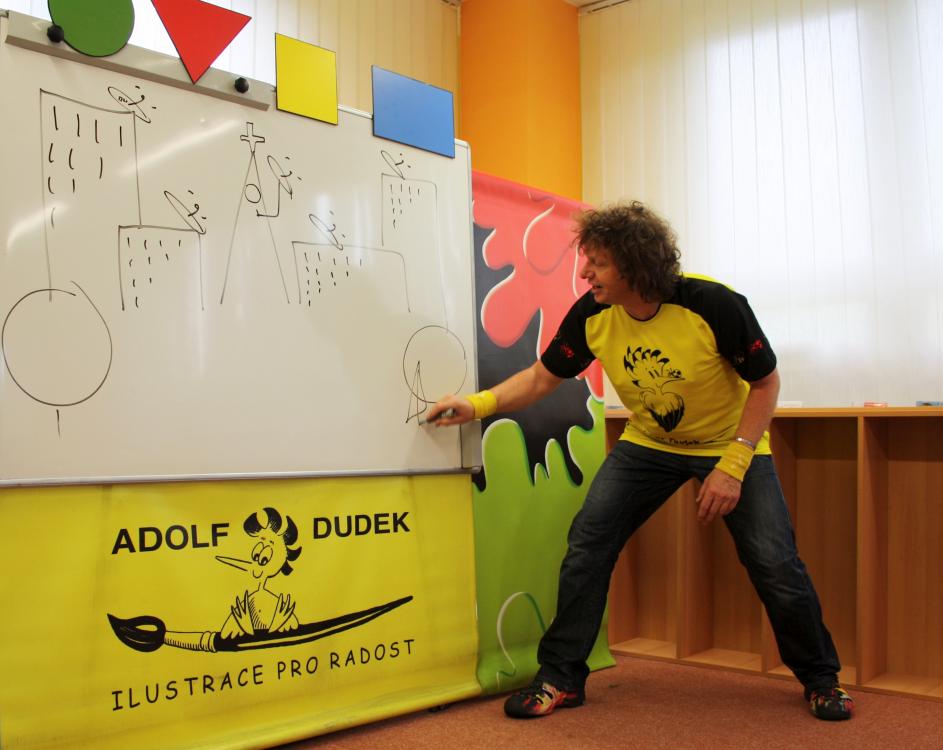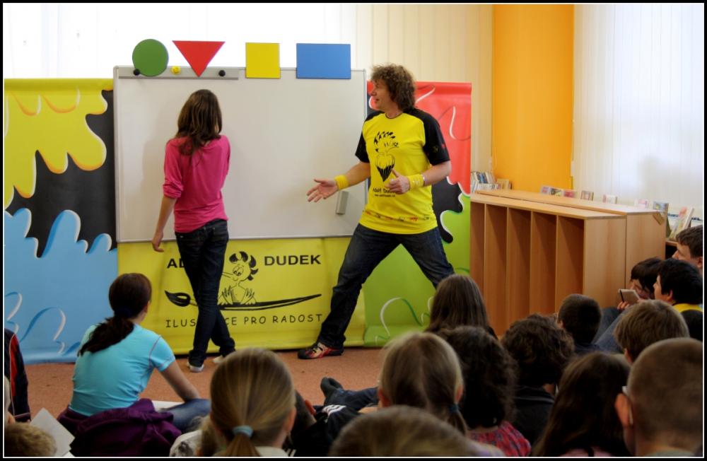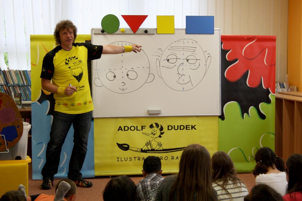 Adolf Dudek dokáže ve své interaktivní show zaujmout všechny věkové kategorie a také zapojit všechny přítomné. A tak po dnešní besedě i ten největší „nešika“ umí nakreslit jakýkoliv obrázek jenom za pomoci základních geometrických tvarů. Také dětem ukázal jak vzniká ilustrace, co všechno musí ilustrátor umět, čím vším se dá malovat... Nechyběly ani soutěže, díky kterým si někteří odnesli ilustrátorův obrázek domů.