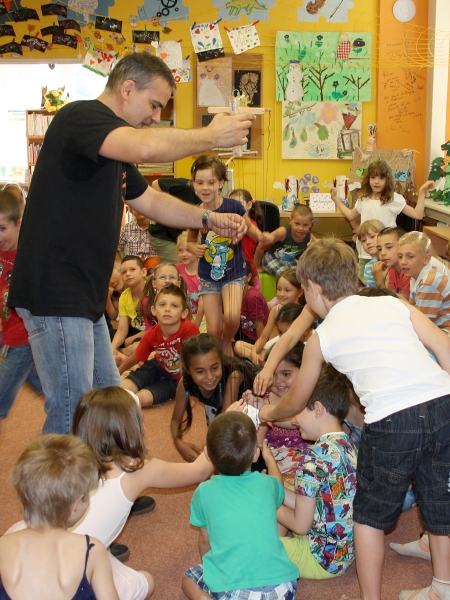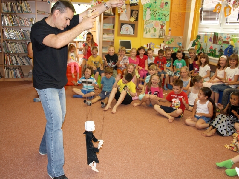 Pro všechny páťáky čekalo překvapení, ještě jeden dárek v podobě loutkoherce Tomáše Richtera, který se loutkoherectví věnuje amatérsky. Nyní se stal, jak říká - profesionálním principálem amatérského divadla. Dětem vyprávěl o loutkovém divadle, o tom jak se dostal k loutkoherectví, ukázal loutky a všichni si také mohli sami vyzkoušet, jak se s takovými marionetami hraje.