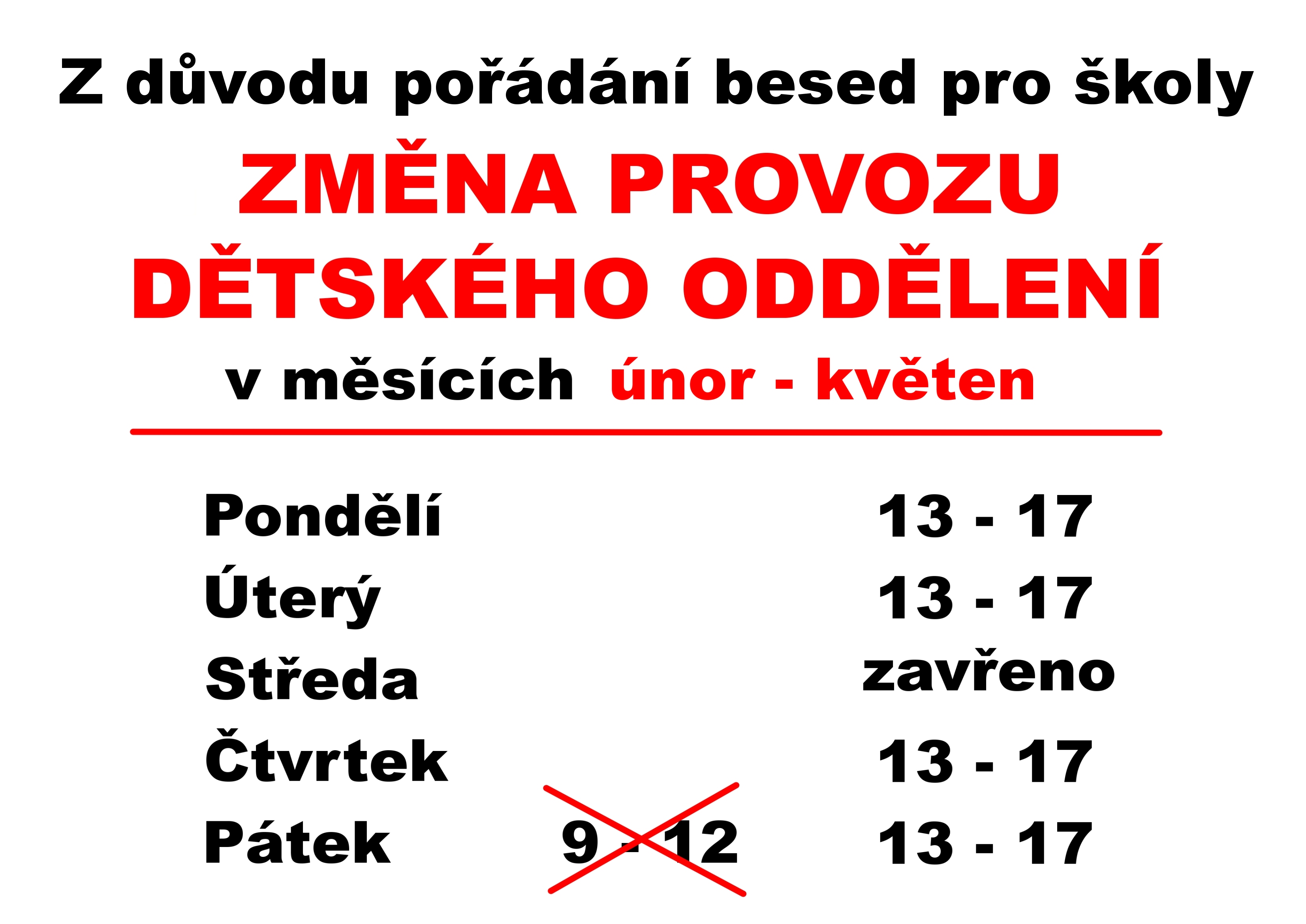 Dětské oddělení : V měsících únor až květen je ZRUŠEN DOPOLEDNÍ provoz z důvodu pořádání školních besed !