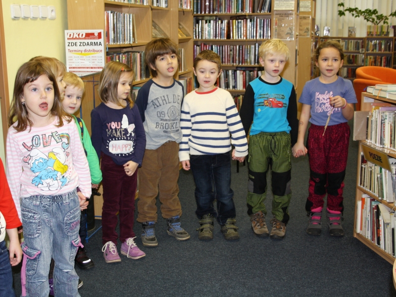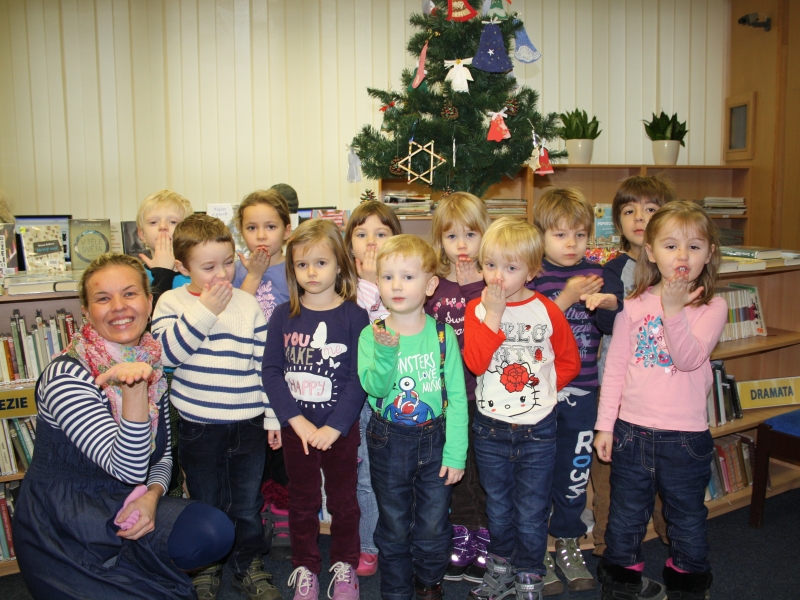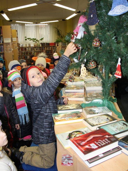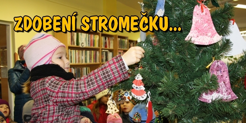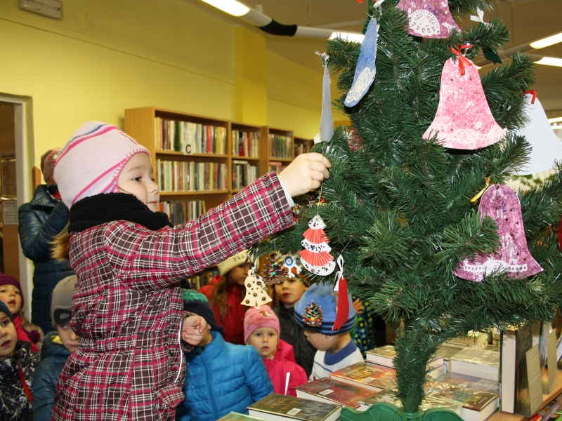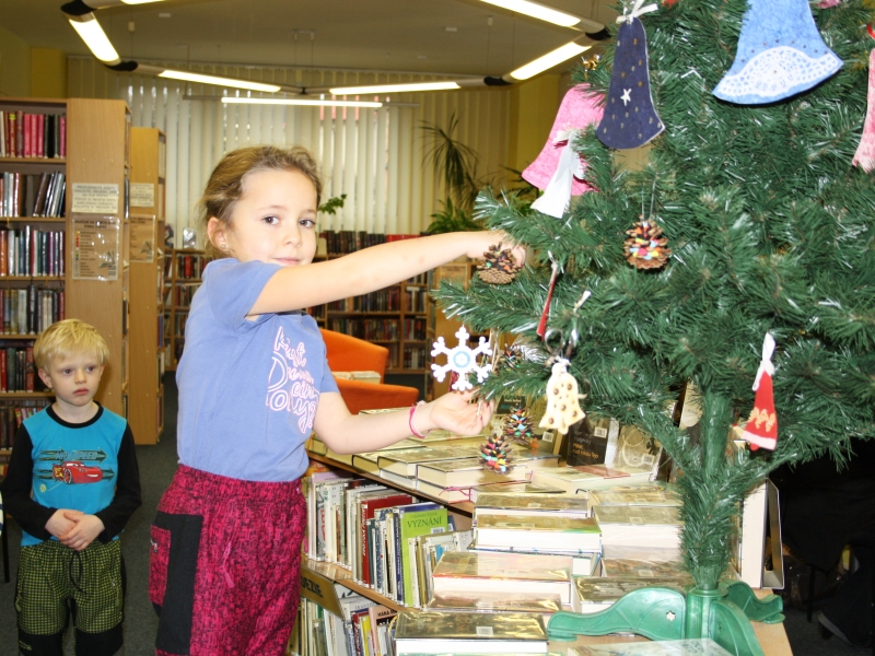 Úkol zněl jasně: vyrobit vánoční ozdobu a přinést ji pověsit do knihovny na vánoční stromeček. A tak se také stalo. Od pondělí 7. do pátku 11. prosince přišlo sedm tříd z pěti mateřských škol. Řada čtenářů dospělého oddělení byla mile překvapena, když jim děti začaly zpívat vánoční koledu. Malí zpěváčci byli odměněni pohádkovou knížkou pro školku a bonbóny.