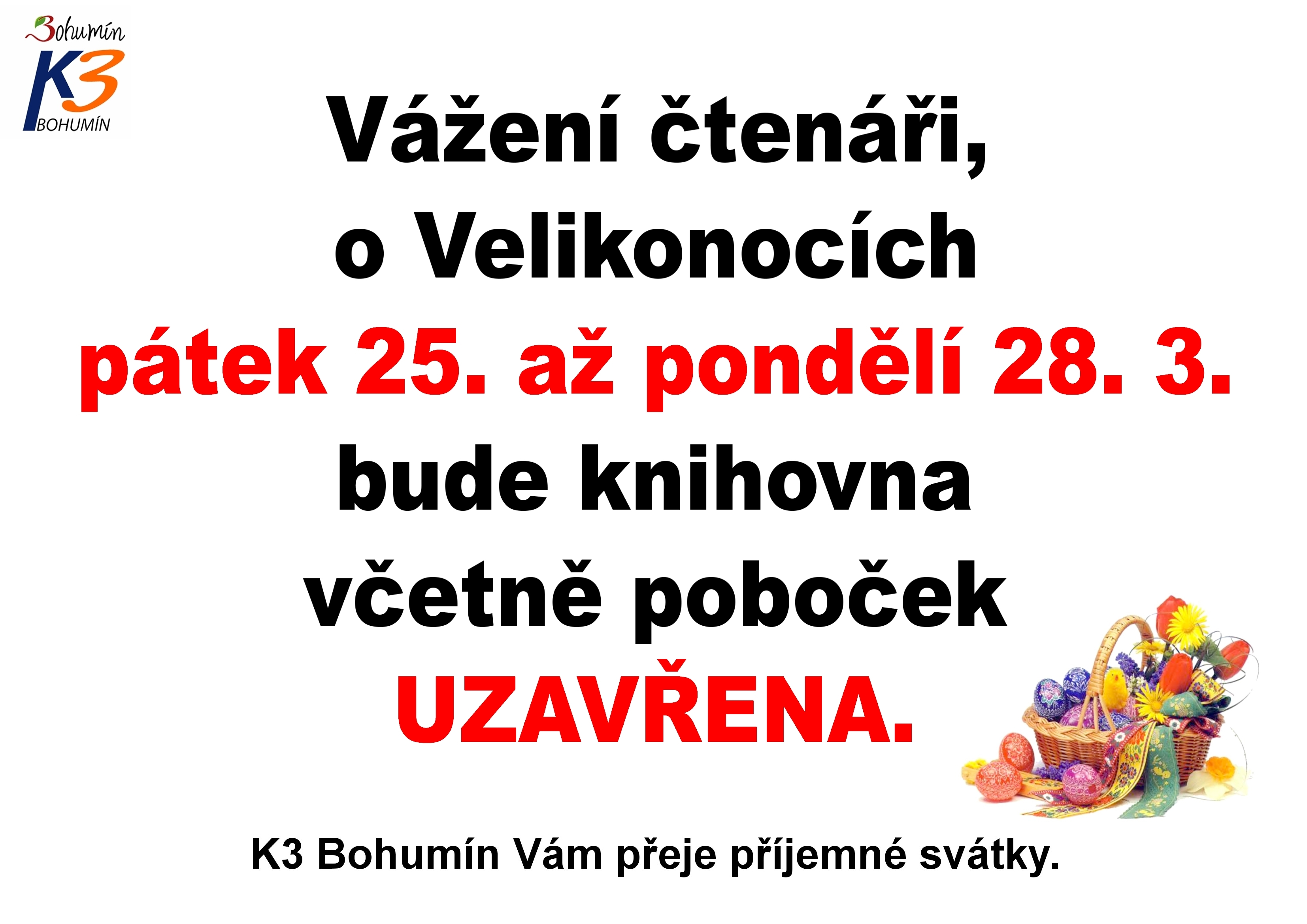 Vážení čtenáři, v pátek 25. 3., v sobotu 26. 3. a na Velikonoční pondělí 28.3. bude celá knihovna včetně poboček UZAVŘENA.