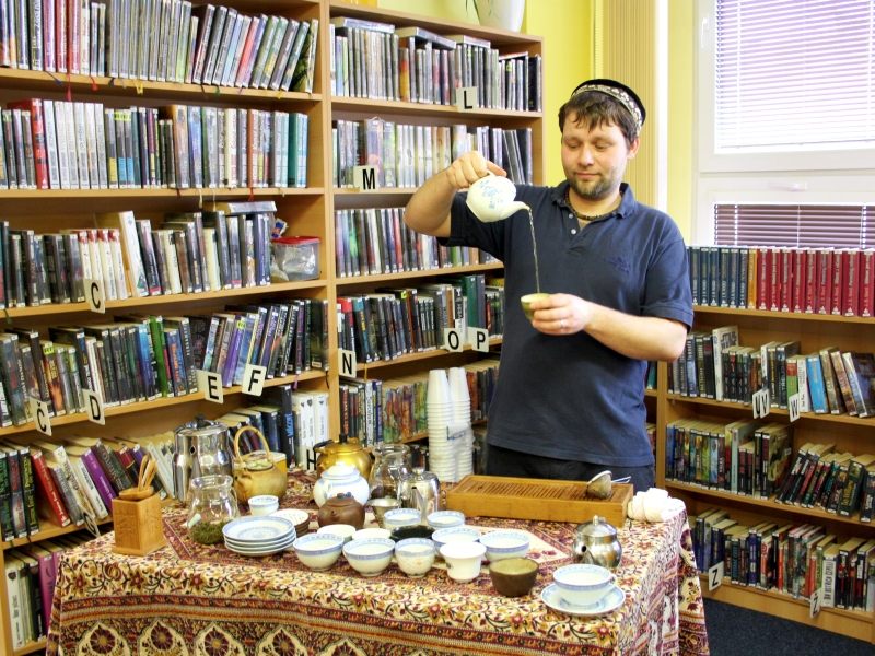 Pondělní odpoledne bylo pro řadu návštěvníků knihovny velkým překvapením. Již při vstupu do dospělého oddělení mohli slyšet hudební produkci Lubomíra Bužmy Khýra. Ochutnávku čajů zprostředkoval čajový tovaryš Jan Fedorowicz.