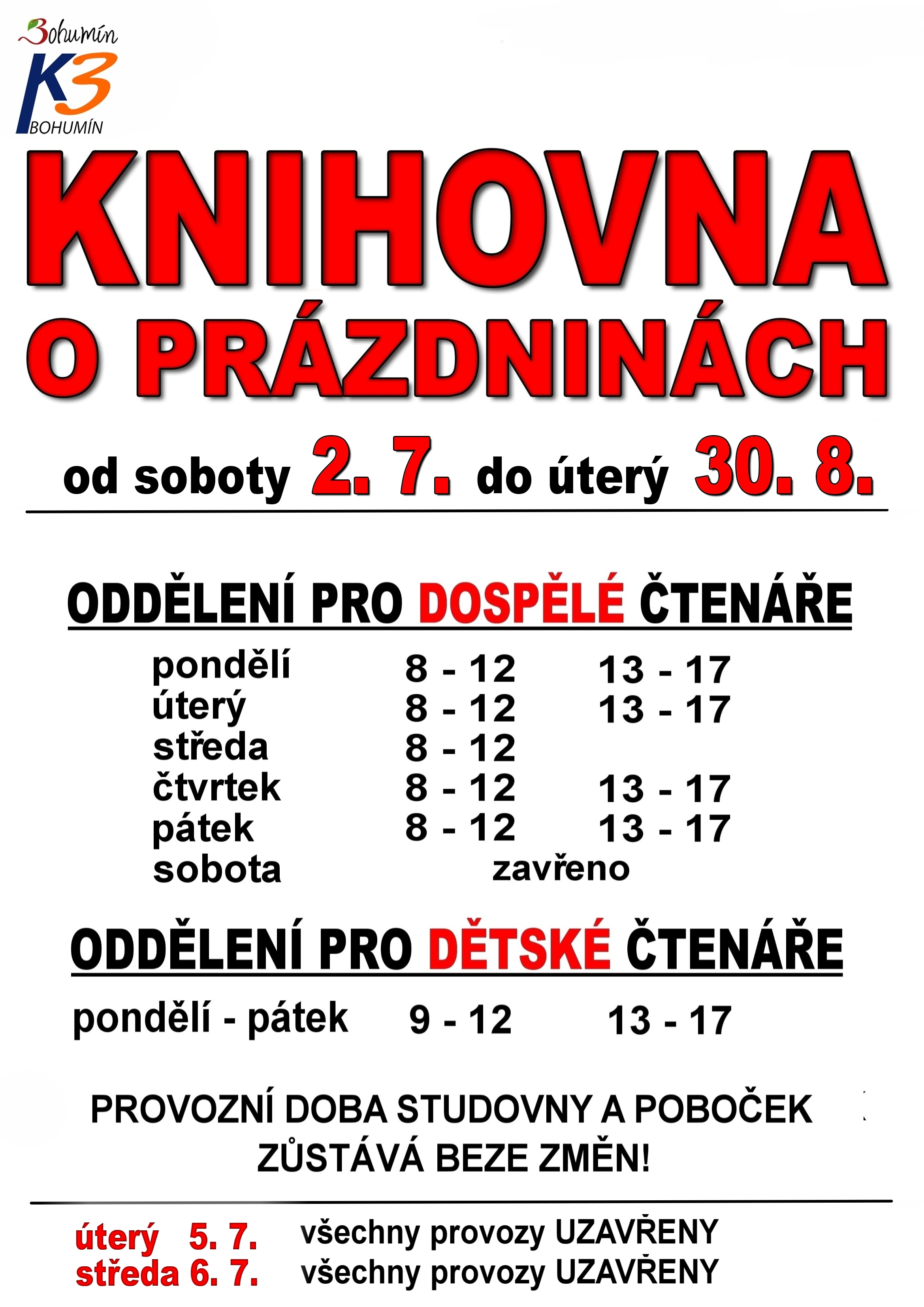 Od soboty 2. července do úterý 30. srpna knihovna mění svou provozní dobu takto: