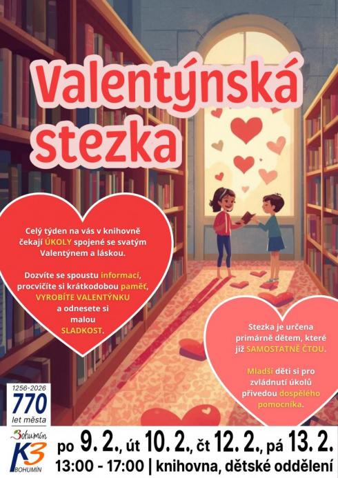 VÝTVARNÁ DÍLNA: Celý týden na vás v knihovně čekají úkoly spojené se svatým Valentýnem a láskou. Dozvíte se spoustu informací, procvičíte si krátkodobou paměť, vyrobíte valentýnku a odnesete si malou sladkost.