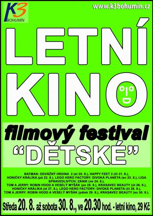 Od středy 20. srpna až do soboty 30. srpna se bude v letním kině konat filmový festival tentokrát na téma DĚTSKÉ FILMY. Začátky představení budou vždy ve 20.30 hod.