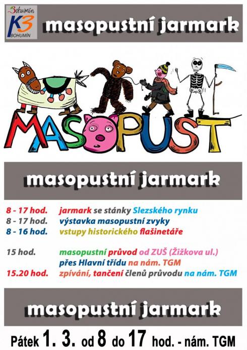 MASOPUSTNÍ JARMARK: Masopustní jarmark se stánky Slezského rynku, hudba, výstava masopustních zvyků a masopustní masky.