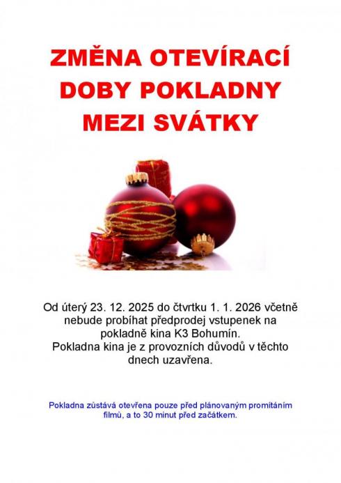 Od úterý 23.12.2025 do čtvrtku 1.1.2026 včetně nebude probíhat předprodej vstupenek na pokladně kina K3 Bohumín.