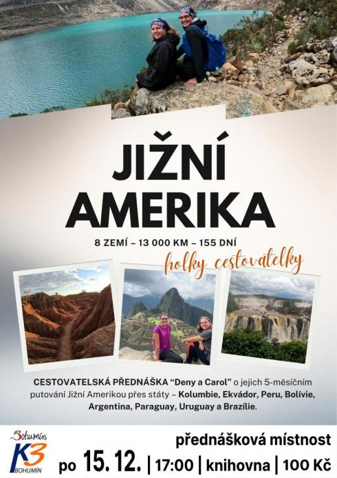Holky cestovatelky Deny a Carol povypráví o 5-měsíčním putování Jižní Amerikou přes státy – Kolumbie, Ekvádor, Peru, Bolívie, Argentina, Paraguay, Uruguay a Brazílie.